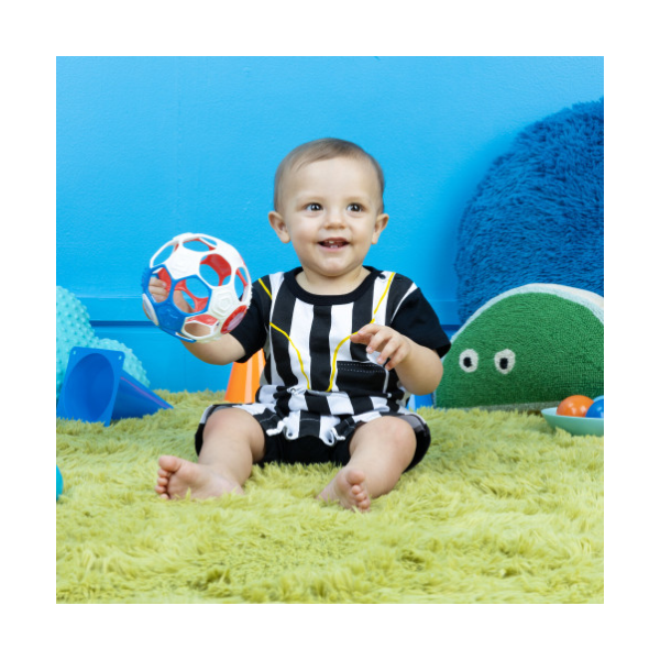 -Pelota con forma de sonajero, le enseña al bebe causa y efecto